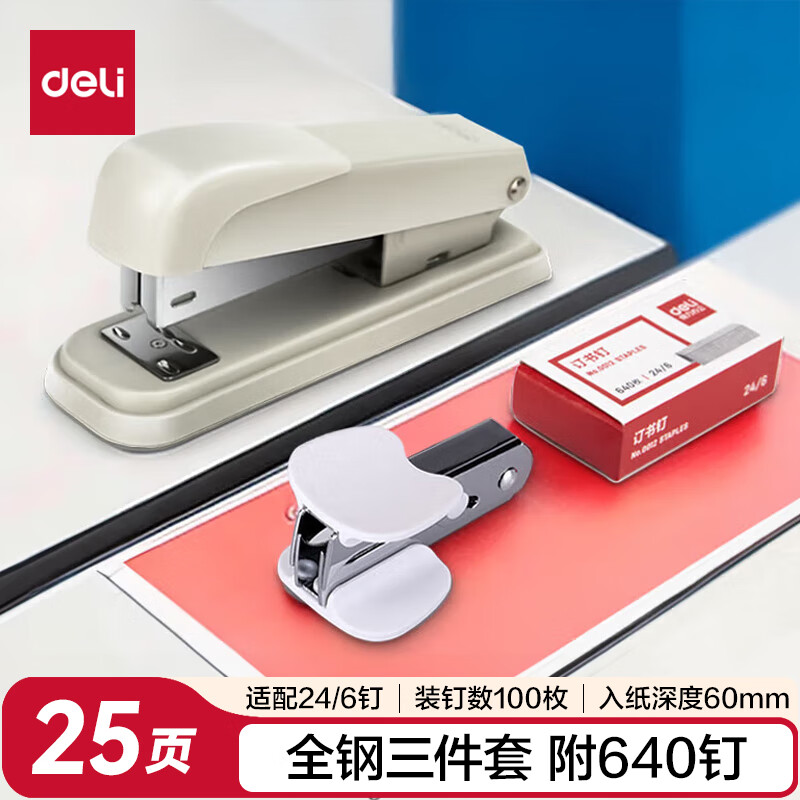 得力(deli)【超级爆款】订书机三件组合套装(订书机 订书钉 起钉器) 订书器 白色0359