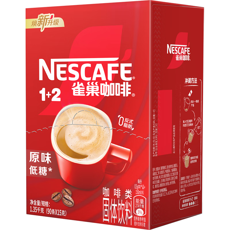 雀巢(Nestle)1+2原味低糖*速溶咖啡三合一冲调饮品90条1350g线条小狗同款
