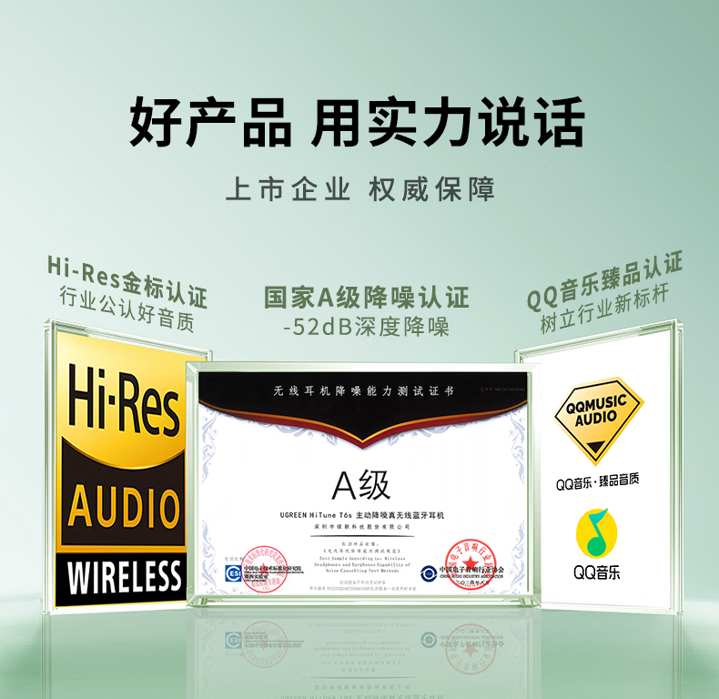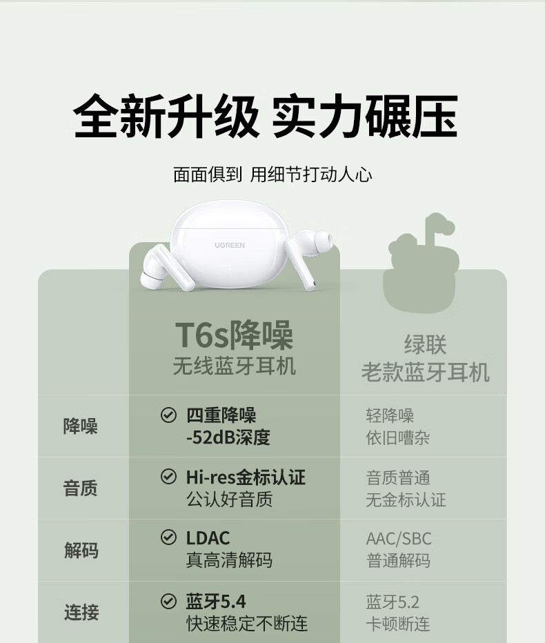 绿联蓝牙耳机T6s入耳式 -52dB深度降噪耳机金标认证空间音效 运动游戏无线耳机适用于苹果华为小米礼物